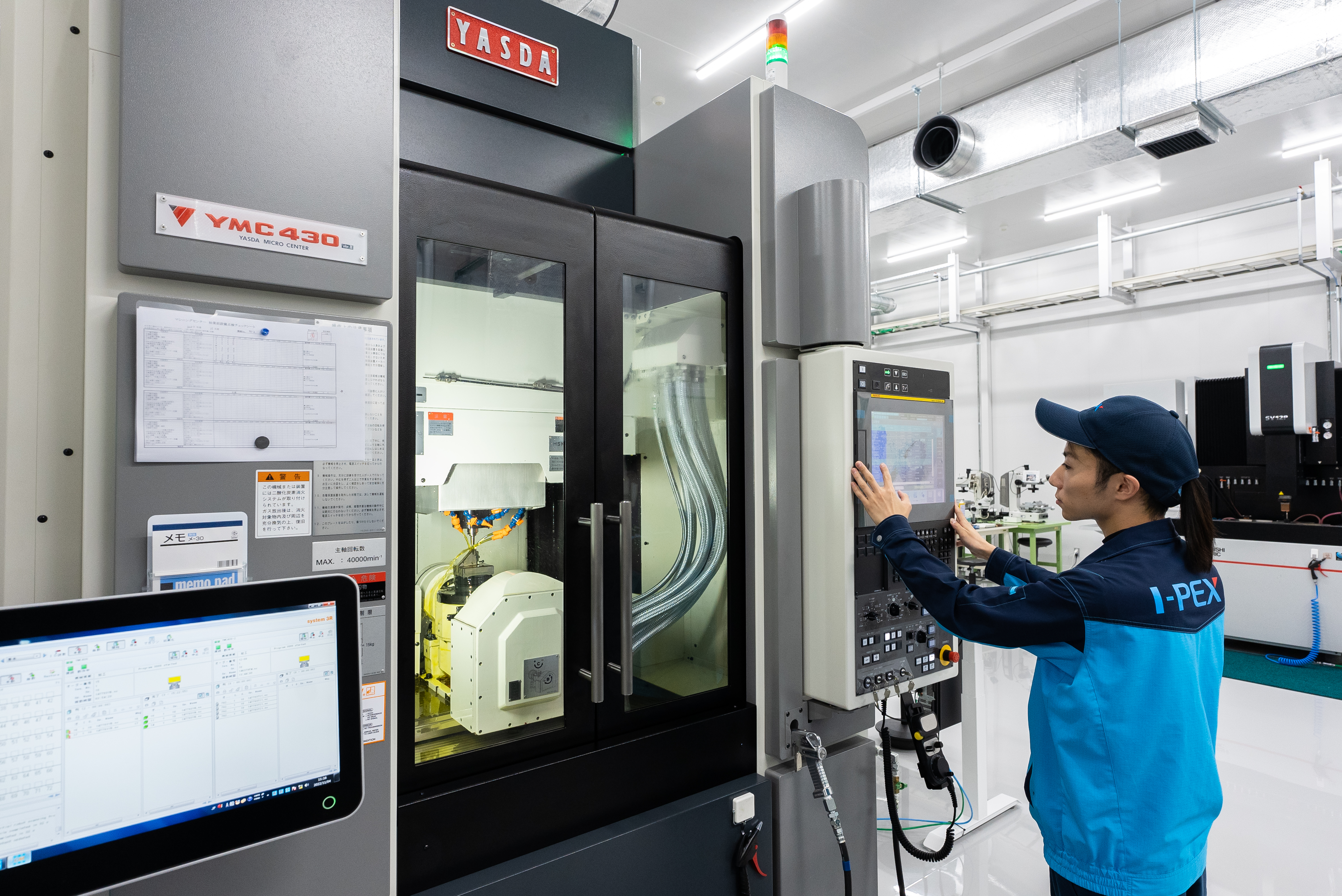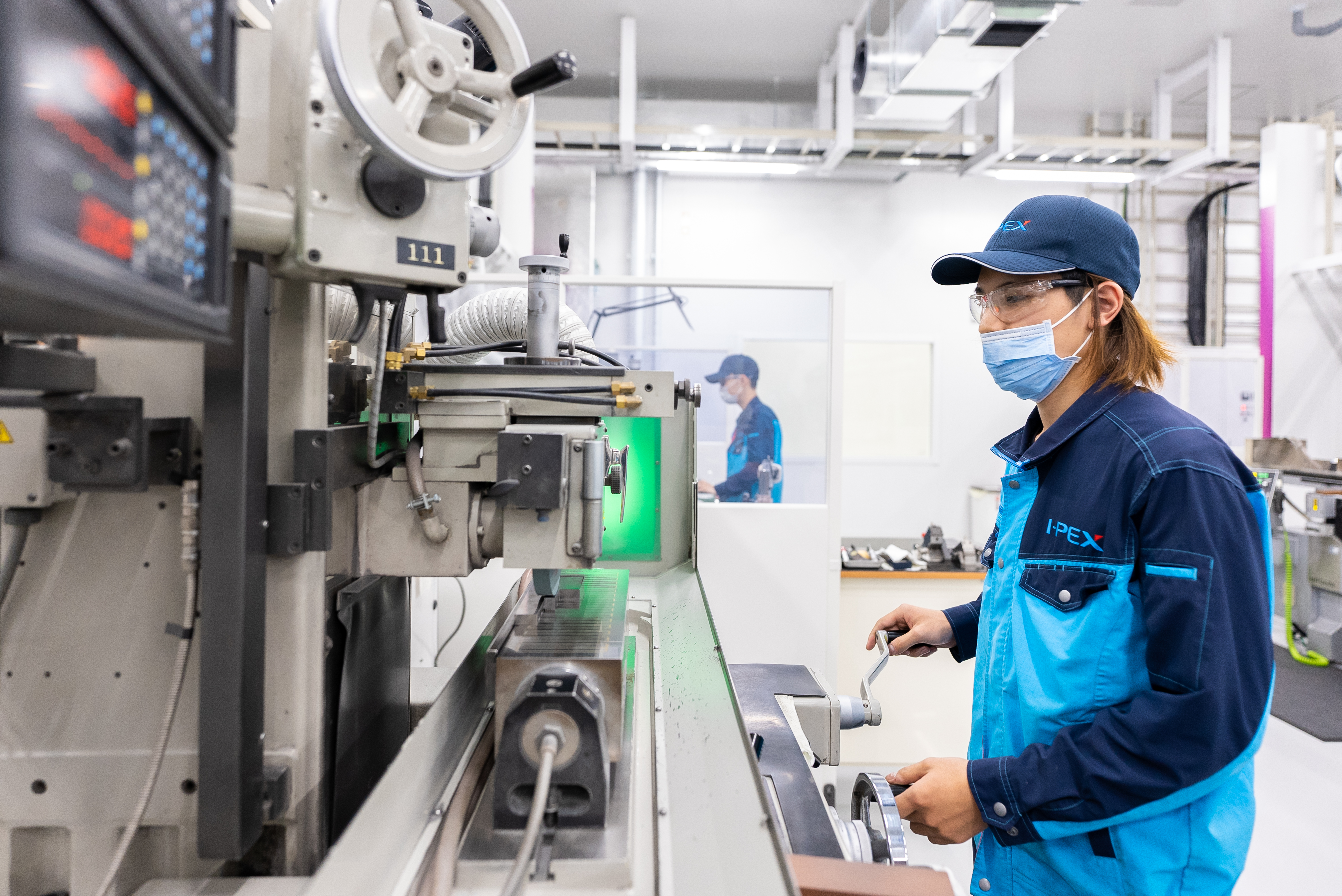 約6,600m²の広大な空間。真っ白な直線の通路から、最新鋭設備と熟練技術が織りなす現場を見学可能。清潔感あふれる美しい工場空間は、I-PEXの技術力と品質へのこだわりを象徴します。