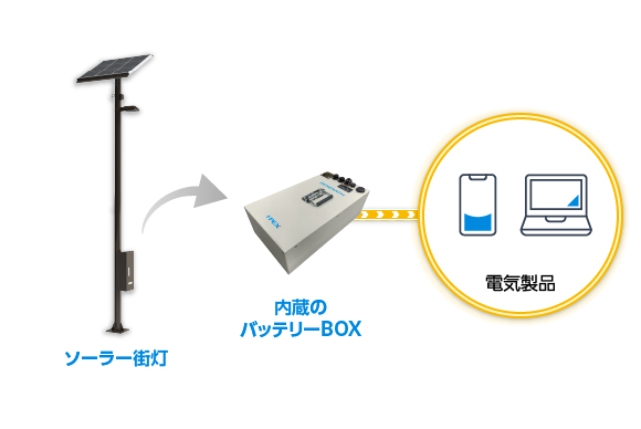 平常時に街路灯として活躍するだけでなく、災害発生時や停電時はポールの筐体からバッテリーBOXを取り外すことができるため、スマートフォンやノートPC等、外部への連絡機器の充電・給電をおこなう非常用の電源としても活用可能です。
