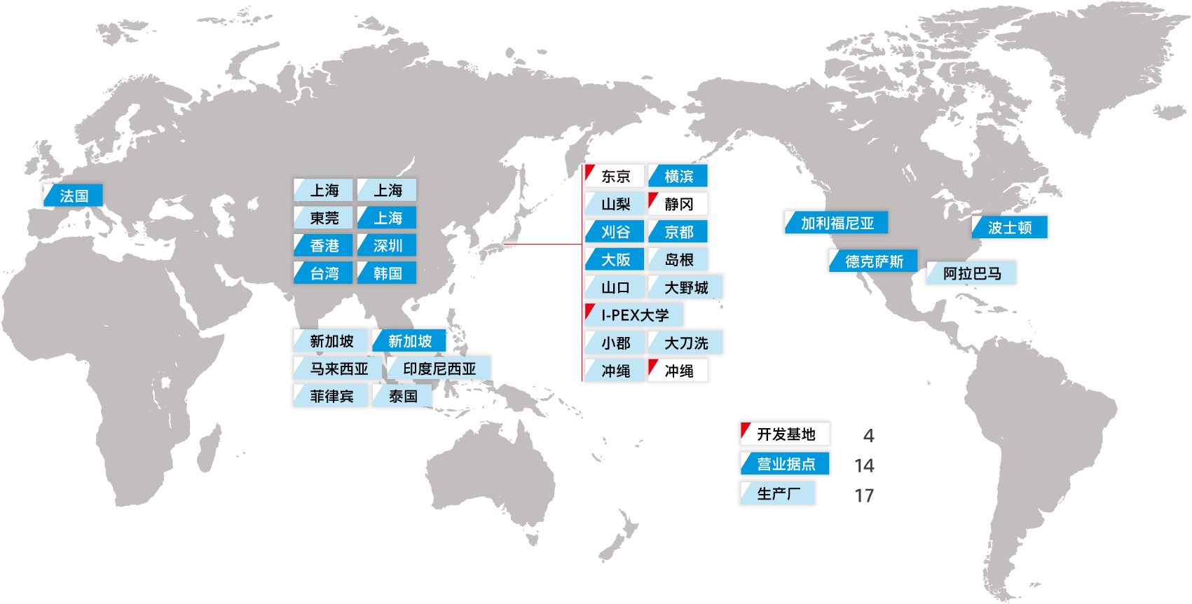 在全球设立了14个营业据点,借助充实的支持体制,并且通过FAE*直接倾听顾客的要求,以求迅速解决问题和提出方案,缩短顾客的开发时间,协助顾客削减总成本。